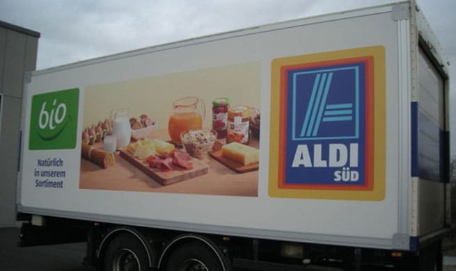 Truck advertising tarpaulin for Aldi Süd in Germany