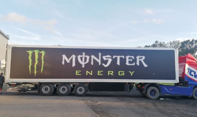 Mit dem revolutionären System & Technik und LKW Werbeplane ausgestattet ist der Monster-Energy Truck in München zu sehen.